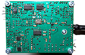 Die Lötseite mit den SMD Bauteilen. In der Mitte der helle IC ist der programmierbare Quarzoszillator SI 570. Rechts ist ein Stück der Antennenleitung zu sehen. Größe der Platine ca 65 x 85 mm.