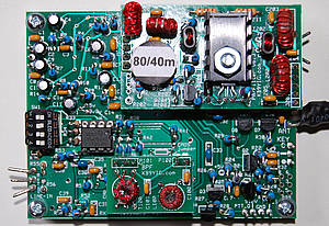 Hier der fertig aufgebaute und getestete Tranceiver mit aufgestecktem 80/40m Pa-Filter und 40/80 m Bandpassfilter. Links der Dipschalter (Mäuseklavier) und der PIC Microcontroller zur Einstellung der Mittenfrequenz des SI 570. Rechts ein Stück der Antennenleitung.